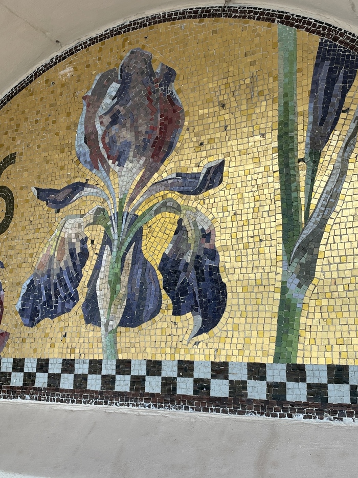Ирисы выполнены с большой реалистичностью и отражают общий стиль модерна, который активно использовал природные мотивы — растения, побеги, даже подводный мир. Золотой фон мозаики добавляет ей торжественности и гармонично вписывается в облик фасада.
