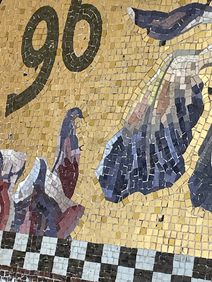 Мозаика обрамлена тёмной окантовкой, которая переходит в шахматный узор в её нижней части. Это решение создаёт визуальный акцент и завершённость композиции.