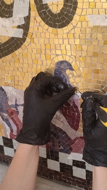 Наиболее поврежденные тессеры смальты осторожно вырубались, чтобы не затронуть соседние фрагменты. Основание очищалось от остатков раствора и пыли с помощью стамески, скальпеля и металлических щеток.