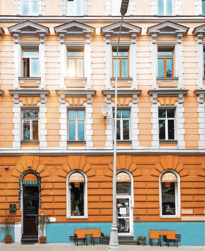 Вы замечали здания на Петровском бульваре или на Цветном? Они прямо вырви глаз. Сине-желтые, истошно розовые, кислотно красные. А около Таганки! Ненормально белые рамки окон, бирюзовые стены — как будто их выкрасили создатели диснеевских мультиков, да даже козырьки над дверями какие-то цветные.