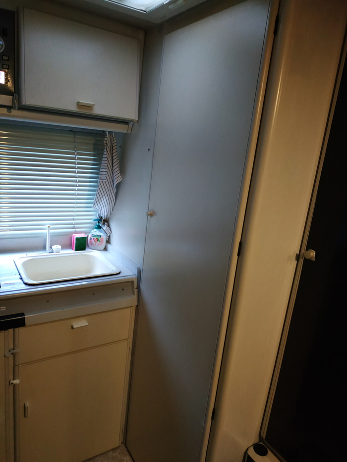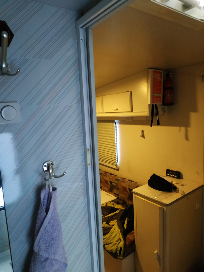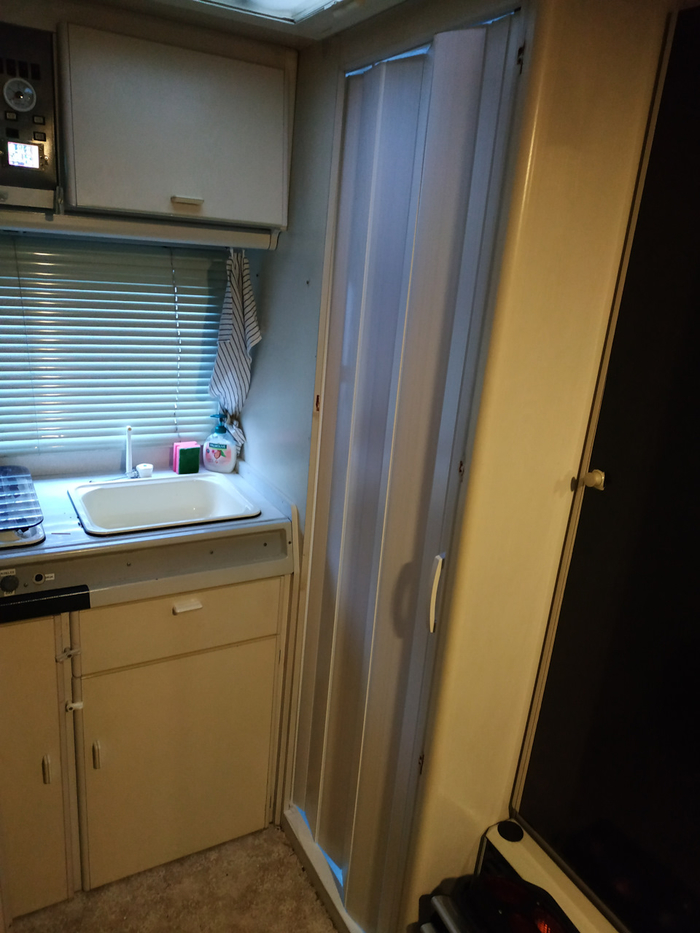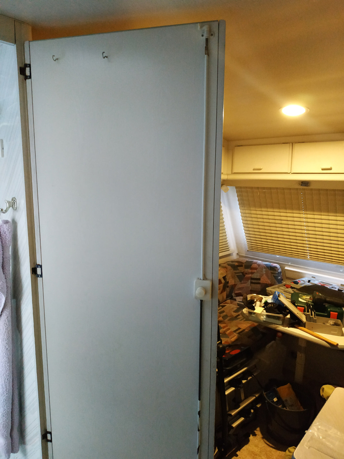 Начала раздражать дверь в туалет. При открытии она перекрывает проход. Если кто-то находится в кухонной зоне, то уже втроём (два человека и дверь) приходится играть в некое подобие "пятнашек" и перемещаться по Вонвагену в процессе открытия двери. Трудно объяснить, не показывая (и когда сам не пользуешься), и вроде не постоянно туда-сюда бегаем, но начало подбешивать. Решено заменить на сдвижную/дверь-гармошку.