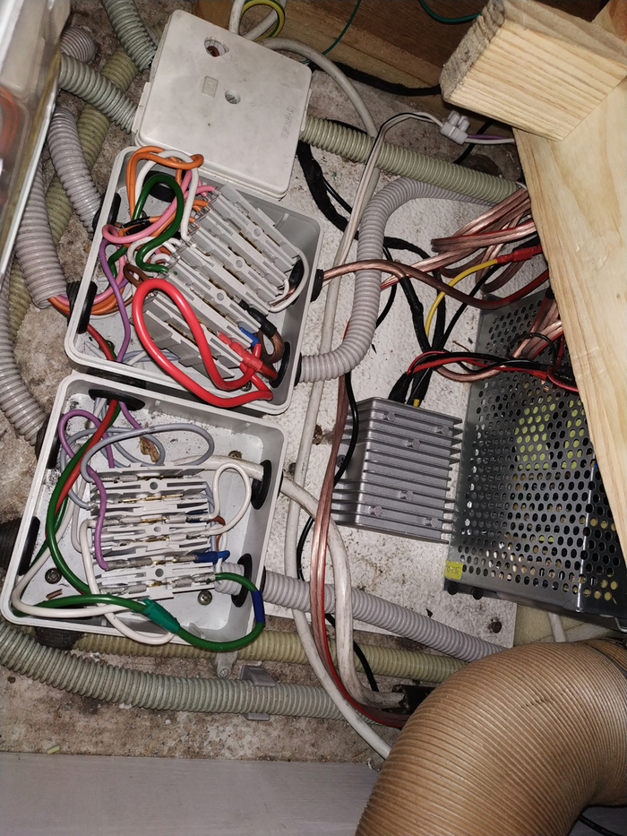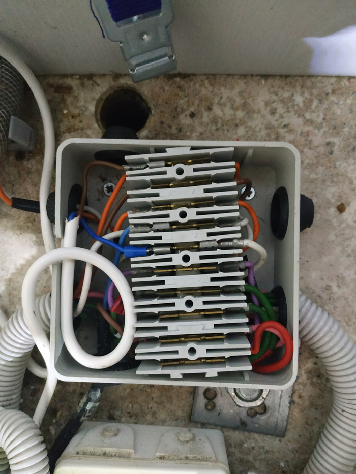 В данном случае маленькая распределяет 220В на холодильник и розетку на кухне. На стенке — распределяет сигналы на задние фонари (стопы, поворотники и т.д.). Ну и на полу — самая непонятная. Внутри: