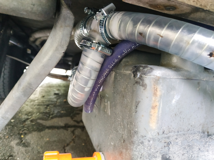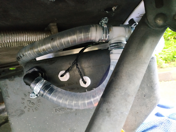 А вот тут шланг разрезан, внедрён тройник и подключён к баку: