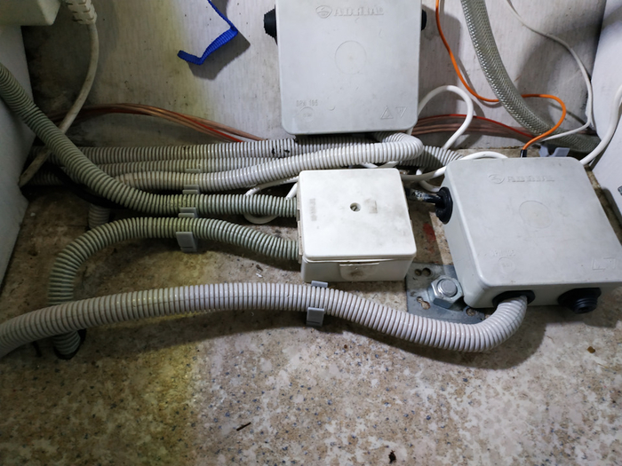 Провода в гофрах приходят из-под пола, распределяются в коробках и либо ныряют обратно под пол, либо уходят к потребителям.