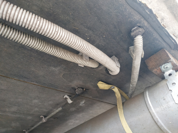 Да, кстати, коричневое на шлангах — это не "шайсе", это остатки мастики, которой я покрасил отверстие, через которое выходит шланг с кухни. Потом протащил шланг, и он снял на себя часть краски. :)