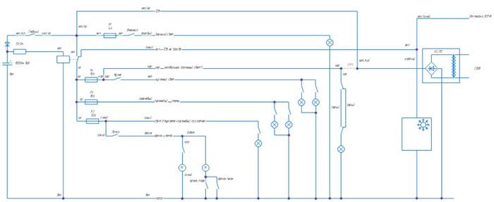 Переписав цвета проводов и направления разбега гофр и, зная схему главного щитка (ранее срисовал, когда дополнительные приборы ставил), нарисовал общую схему: