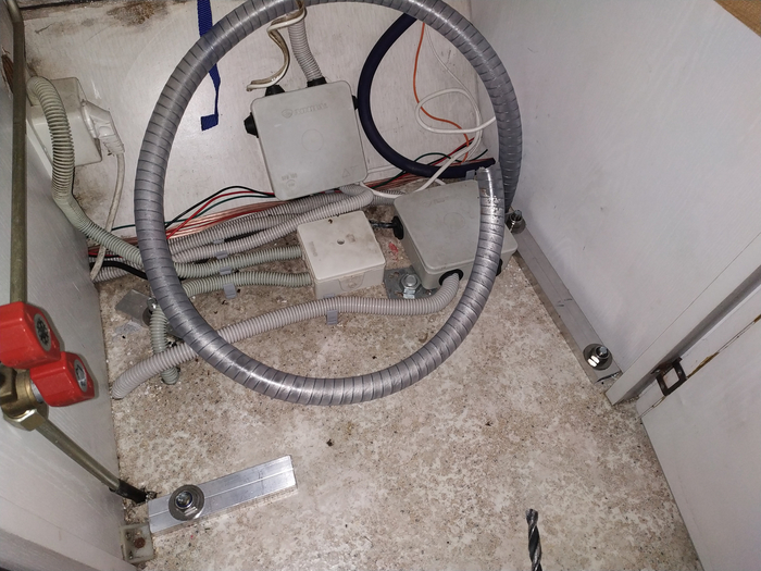 Направо уходит гофра с сигналами задних фонарей. Налево гофра с 220В и остальными проводами. Эти две гофры приходят к коробкам, над которыми я ставил аккумулятор.
