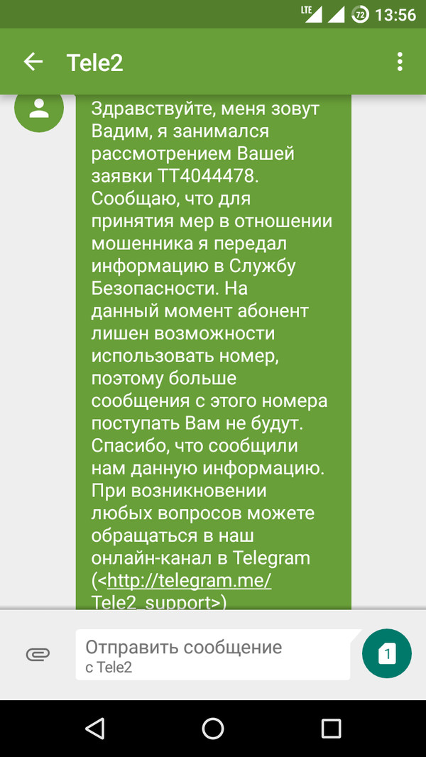 Скрин сделал уже в офисе. Общее время между общением с оператором и приходом СМС о решении проблемы - 30 минут. Очень быстро, как на мой взгляд. Общее время на общение с поддержкой Tele2 - 10 минут.