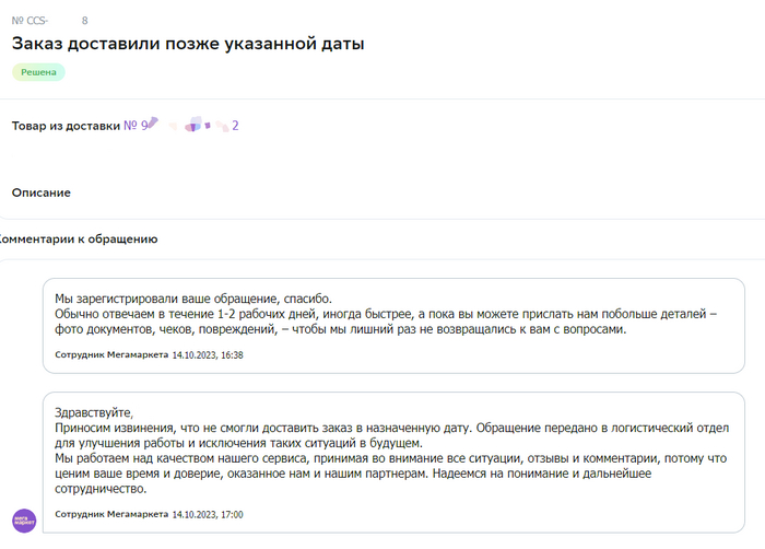Попробовал тут купить на мегамаркете с их доставкой, заказал 13-го в заказе 3 товара от разных продавцов, деньги списали товар типа отправили, вроде все хорошо. Сроки доставки поставили от 6 до 12 дней, ну да ладно - вроде терпимо, подходят контрольные сроки первых заказов и с задержкой на сутки-двое я их получил.