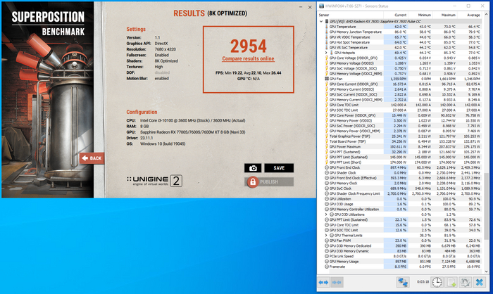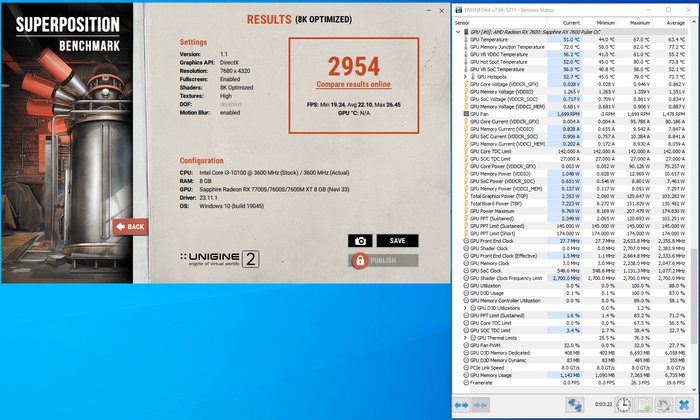 5. Запустите бенчмарк Superposition с максимально тяжёлым пресетом (если у вашей видеокарты до 4 Гб видеопамяти, то выбирайте 1080p Extreme, если 6 Гб, то 4К Optimized, если 8 и больше, то 8K Optimized), HWinfo должен быть открыт где-нибудь рядом.