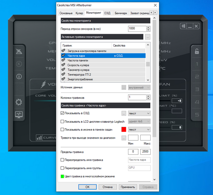Откройте в настройках MSI Afterburner вкладку "Мониторинг", найдите параметр "Частота ядра", установите галочку на "Показывать в ОЭД" и нажмите "Применить". Это нужно, чтобы увидеть частоту ядра видеокарты во время тестирования. Вы также можете выбрать отображение и других параметров (температура, процент загрузки, скорость вентиляторов, фпс, и т.д.).