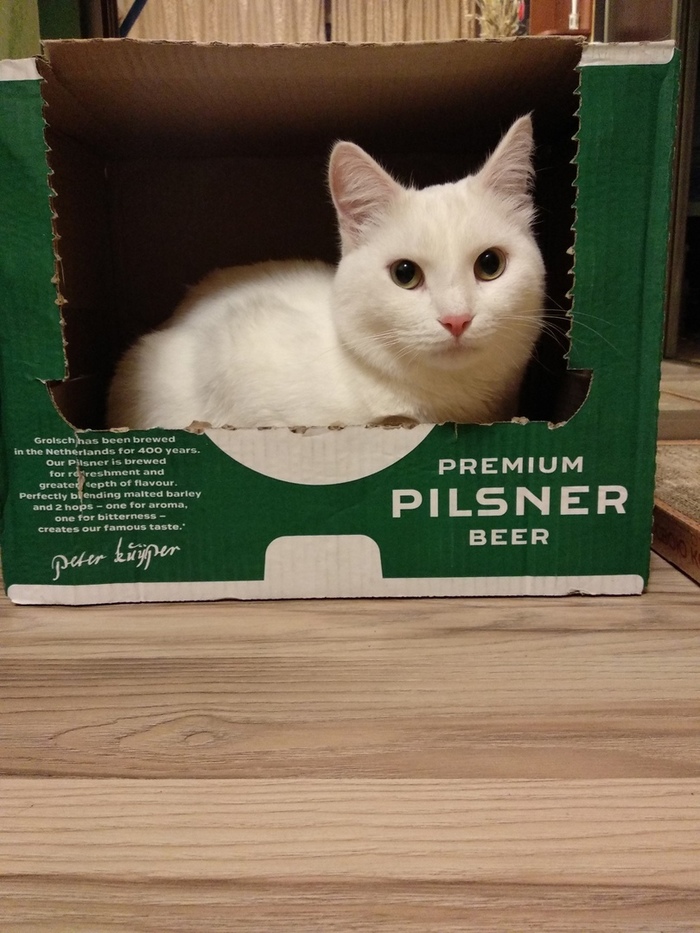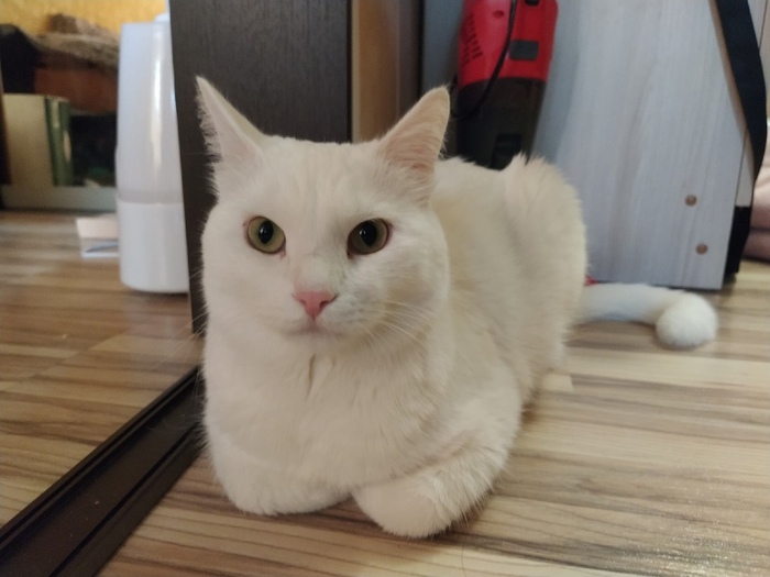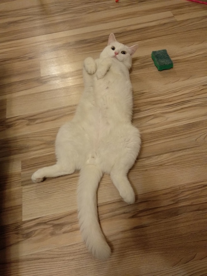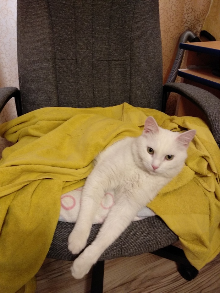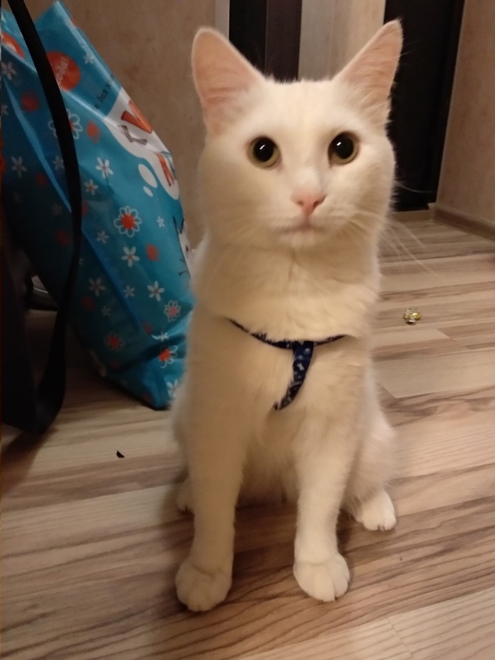 Со временем кот полностью преобразился! Это стал белоснежный шикарный красавец с блестящей мягкой шерсткой, очень игривый котейка. Милый ласкуша и мурлыка. Ужасно любопытное создание – он лазает везде, куда может добраться, иногда мы даже не можем его найти. Особенно любимы ему шуршащие пакетики, тут главное – не забыть убрать их на ночь в шкаф. Любит играть со струйкой воды в раковине, ватными палочками, резинками для волос, шнурочками и веревочками, и вообще, может сделать игрушку из чего угодно! По вечерам Беляшик приходит ко мне и долго сидит у меня на груди, внимательно глядя в глаза. А потом начинает тереться о мое лицо, облизывать подбородок и щеки. При этом тарахтит, как трактор. Любит спать у меня под бочком. Может долго сидеть на подоконнике, наблюдая за птичками, но особенно ему нравится смотреть, как эвакуируют автомобили у нас под окнами.