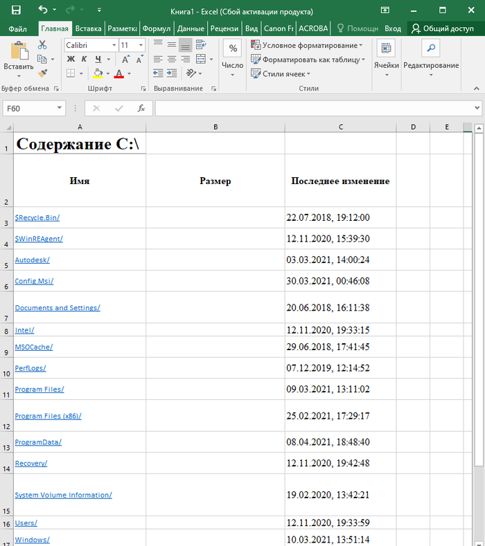 Иногда возникает необходимость отобразить содержимое диска или папки в виде таблицы. Чаще всего используют скриншот, но его невозможно редактировать и копипастить имена файлов/папок. Можно использовать скачанные утилиты, но я случайно обнаружил такое свойство у интернет-браузера (Проверено на Microsoft Edge, Chrome): в адресной строке вбить адрес диска/папки. Браузер отображает содержимое с возможностью навигации по папкам. Содержимое можно сохранить в html, mhtml, экспортировать в pdf, или в Excel, Word копипастом в виде таблицы.