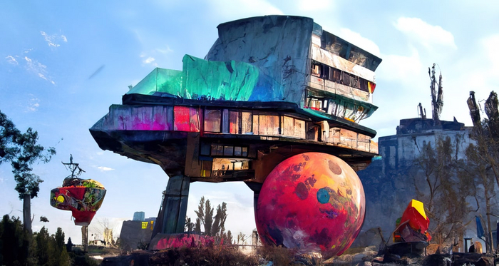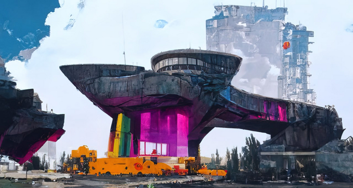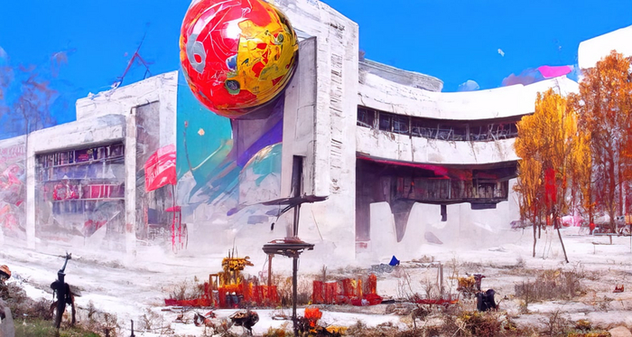 Текстовый запрос для генерации арта - "A Soviet Retro Futurism in Brutalism architecture and coloful planets in fauvism style by Ismail Inceoglu and by Marc Chagall"
