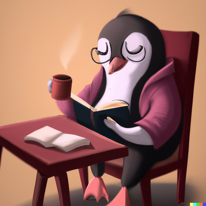 "Пингвин мирно читает книгу пока пьет кофе утром"