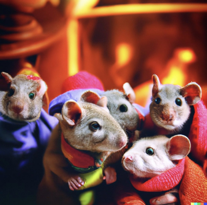 "Макро снимок на 35мм пленку большой семьи мышей в шапках уютно у камина"