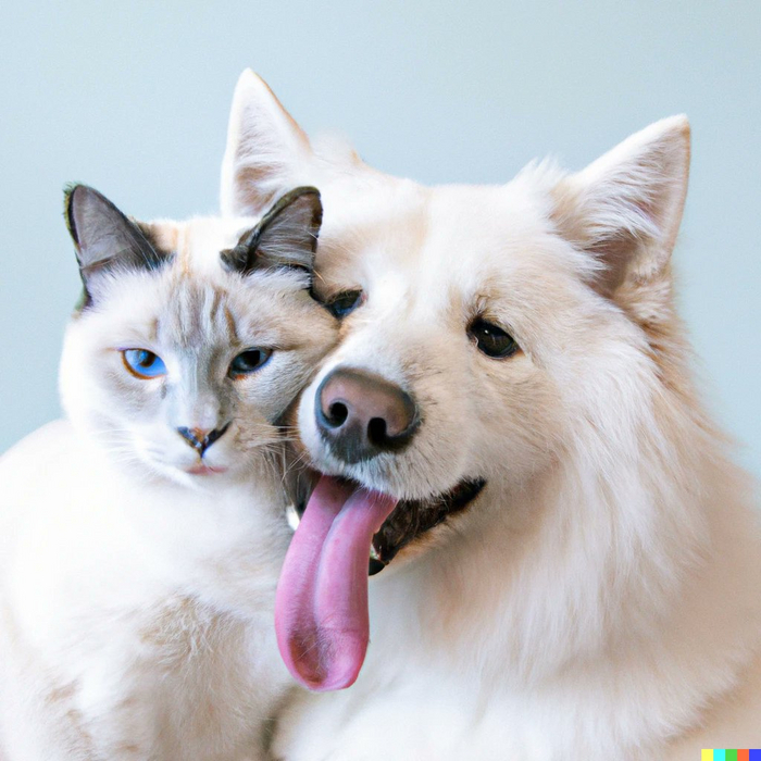 "Фотография пса Самоеда с высунутым языком обнимающий белую Сиамскую кошку"