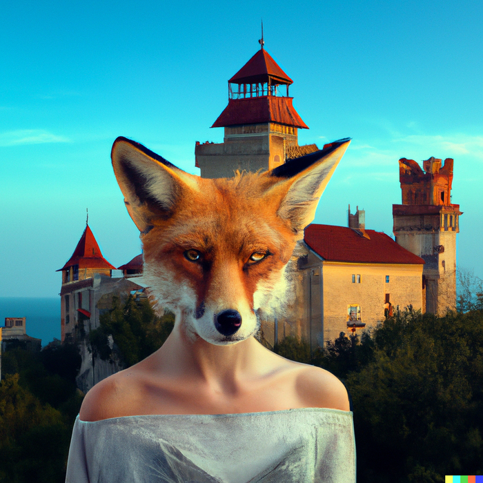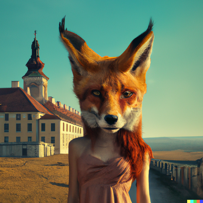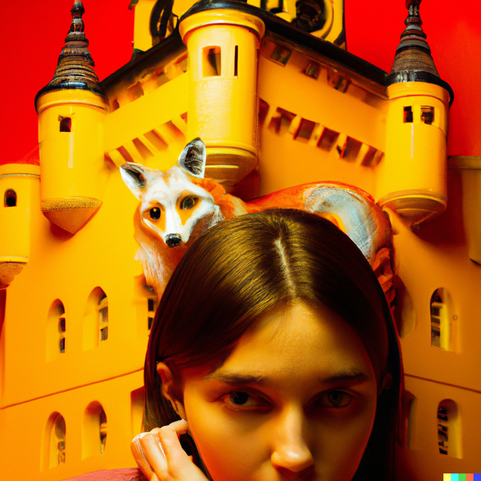 Девочка лиса рядом с абстрактным замком, фото в стиле Уэса Андерсона