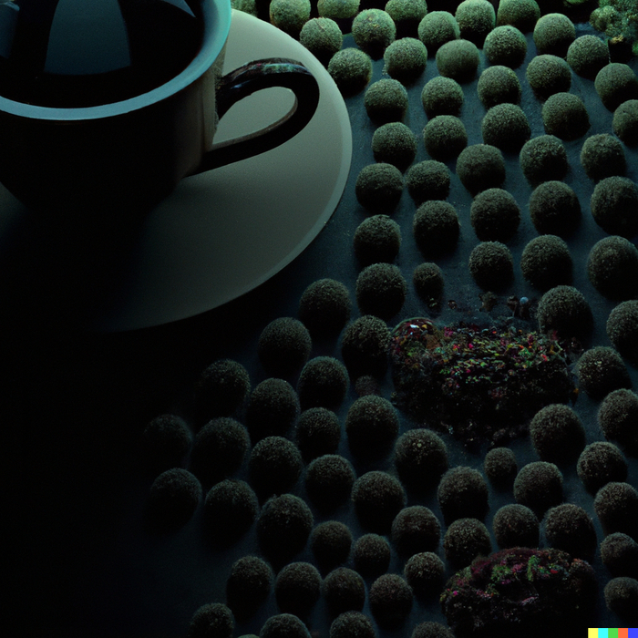 Фрактальные зерна кофе рядом с кружкой кофе, цифровый рисунок