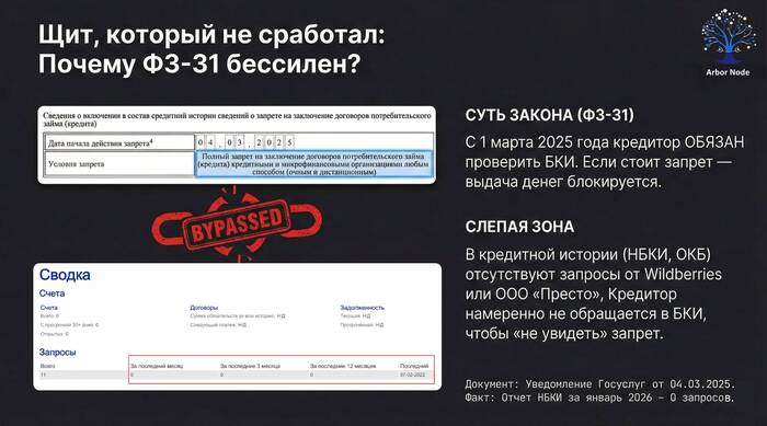 Сделка оформляется не как «кредит» и не как «заём» — а как «Договор поручения». Якобы ты поручаешь торговцу трусами оплатить за тебя товар. Понимаешь фокус? Раз это «поручение» — значит, в Бюро кредитных историй запрос не идёт. Значит, твой самозапрет «не виден». Значит, закон формально не нарушен.