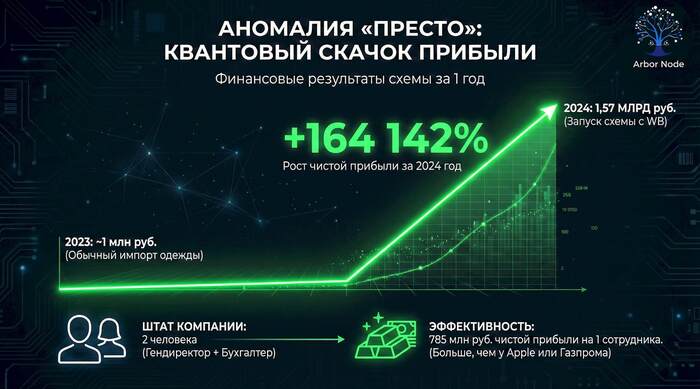 Выручка компании за 2024 год — 12,5 млрд рублей (+273%)!! Прибыль — 1,6 млрд рублей (рост +164 142%)!!!! Штат — всего 2 человека (Гендир и уборщица Люся).