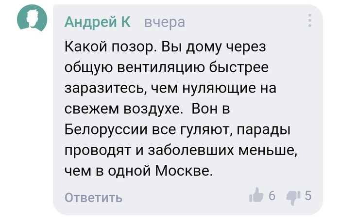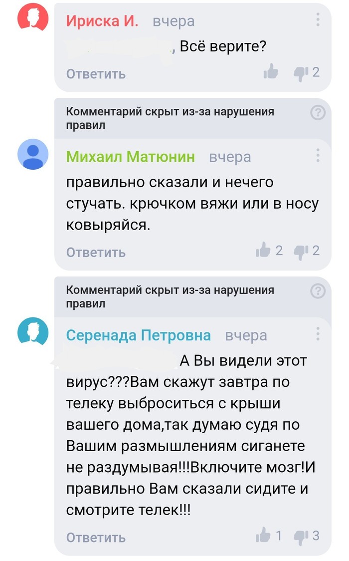 Нашлись даже те, кто в вирус вообще не верит. Мне сразу вспомнилась история, как на физике мой одноклассник подошел к розетке и начал спрашивать учителя: "Вот розетка. Где там ваши электроны? Я не вижу их! Нет их там!"