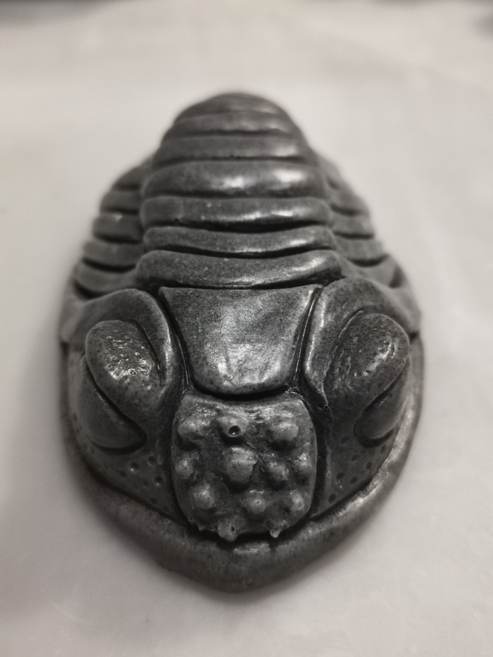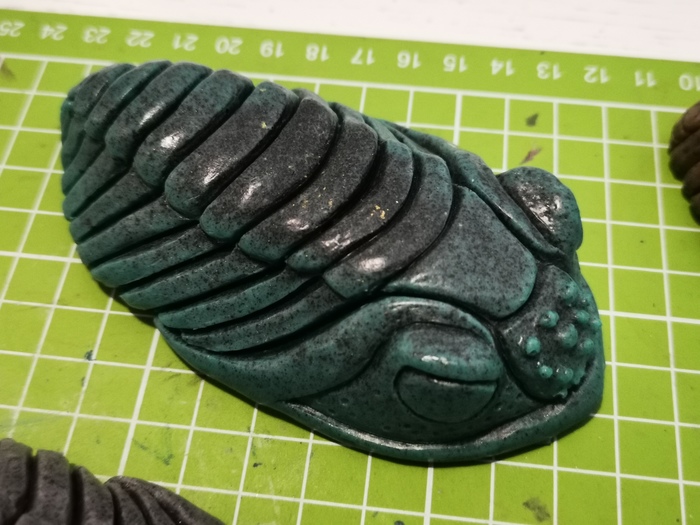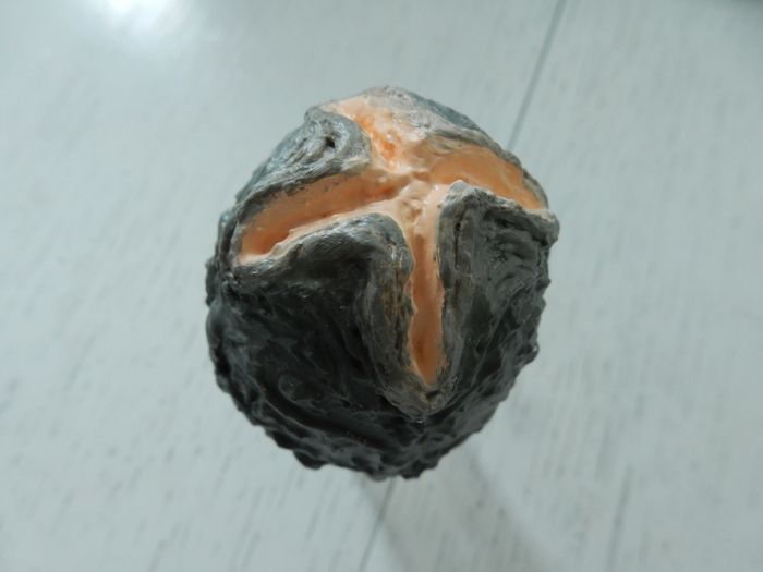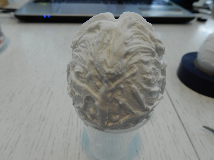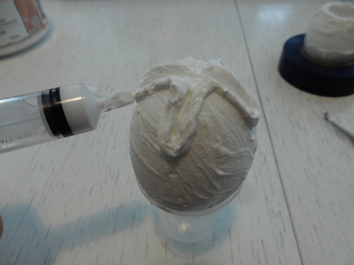 Далее аккуратно шпателем формируются морщинки вокруг лопастей яйца (советую иметь перед глазами референсы из интернета). Акриловая паста хороша тем, что полностью сохраняет объём после высыхания, и из неё можно делать практически любые рельефы, но из-за своей консистенции это в основном возможно только с использованием специальных форм. И тут придётся немного помучиться, прежде, чем выйдет нужный результат (и помните про пальцы! это очень важный инструмент для разглаживания неровностей). Поскольку паста сохнет довольно медленно и с образованием корочки, то можно попробовать подредактировать рельеф в процессе высыхания, но тут надо ловить правильный момент.