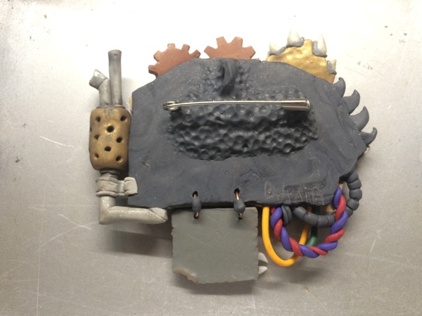 После высыхания проливки драйбрашем наносится тёмный цвет (тут у меня тёмно-коричневый металлик). Для этого на жёсткую кисть наносится краска, а затем избыток краски снимается до тех пор, пока кисть не останется полусухой. Благодаря этому краска остаётся только на выпуклых частях добавляет объём изделию.