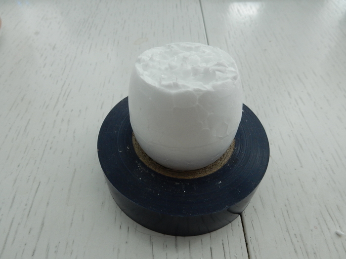 Некоторые из яиц должны быть раскрытыми, чтобы заставить жертв паниковать и судорожно искать огнемёт на кухне. Для этого с пенопластовой заготовки снимается где-то около четверти верхушки, а затем любым острым предметом проковыривается полость (можно пальцами, очень удобно). Самое главное оставить стенки достаточно толстыми и случайно не проткнуть яйцо. Чтобы удобнее было работать с яйцами, я нашла для подставки в виде катушки изоленты и мерного стаканчика из под лекарств (да, я та ещё ленивая жопка).