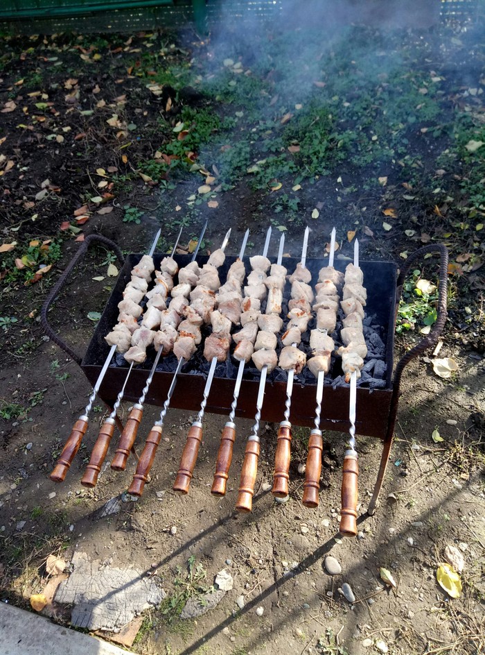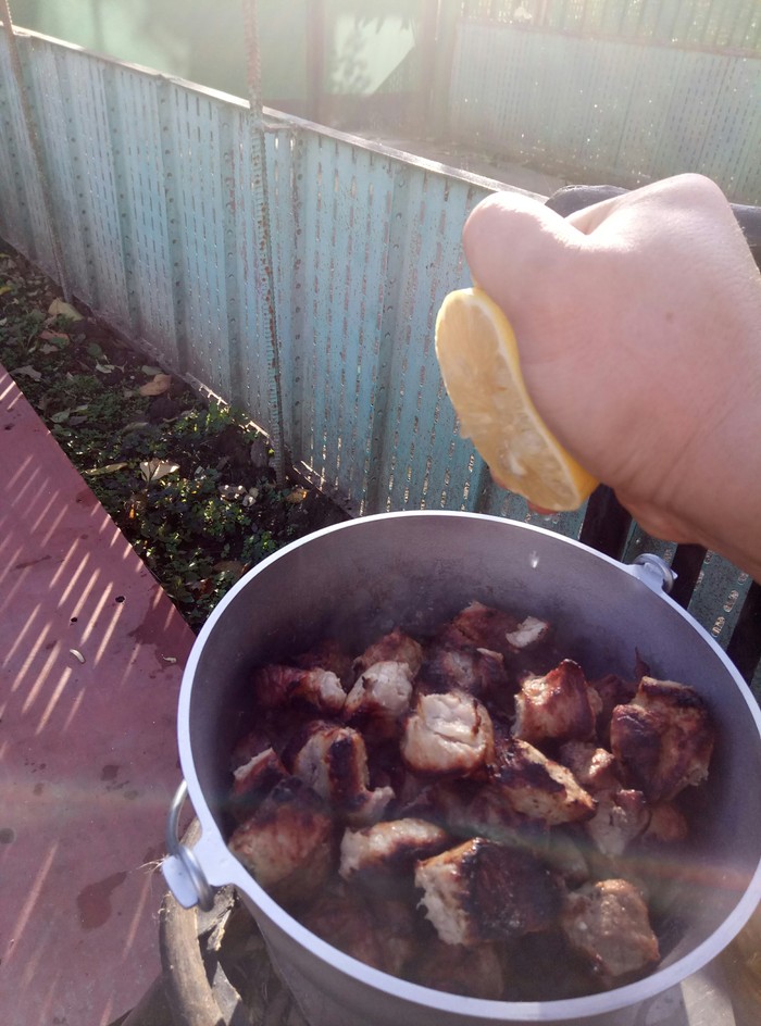 Я думаю не надо расписывать как правильно насаживать мясо на шампура, как готовить. Напишу только что главное чтоб не было открытого огня, готовность проверять ножом. Но лучше чтоб был немного недожареный (это не означает чтоб с него текла кровь, просто чтоб внутри была жидкость)