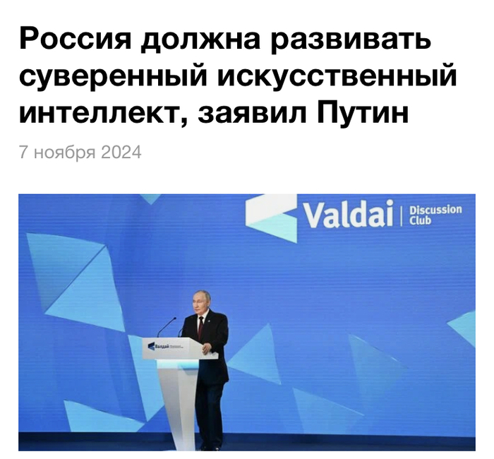 1165 Deggis Искусственный интеллект1 1 год назад Показать полностью 2 Искусственный интеллект Владимир Путин Суверенитет Картинка с текстом Интернет 121 17 10 9 1 Ещё 0