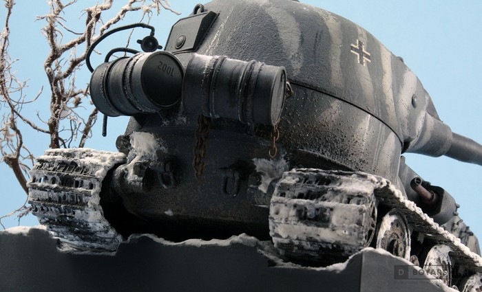 Машина носит собирательный образ, но изначально делалась по конкретной выдержке из наградного листа (фото прилагается). Если нет времени читать, то в двух словах - танк проходил по минному полю. Главное условие - потрёпаный внешний вид танка и снятые сегменты надгусеничных полок, поврежденные взрывами.