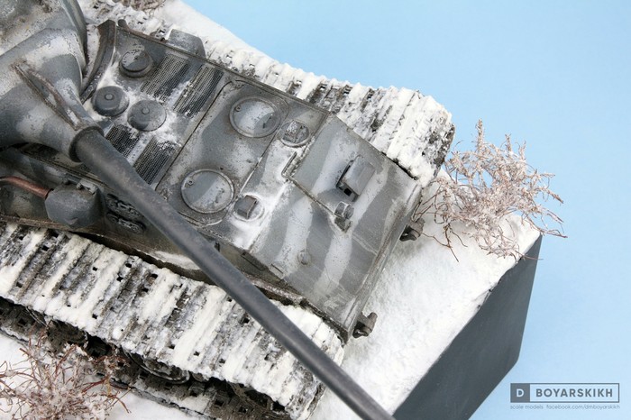 Подставка полностью самодельная. Борта из толстого пластика, объём набран пенополистиролом и гипсом, текстуры снега и земли выполнены различными готовыми и подручными средствами. Растительность из проволоки и распущенного каната мне предоставила фирма Modellers of Fortune в лице Дмитрия Тебенькова.
