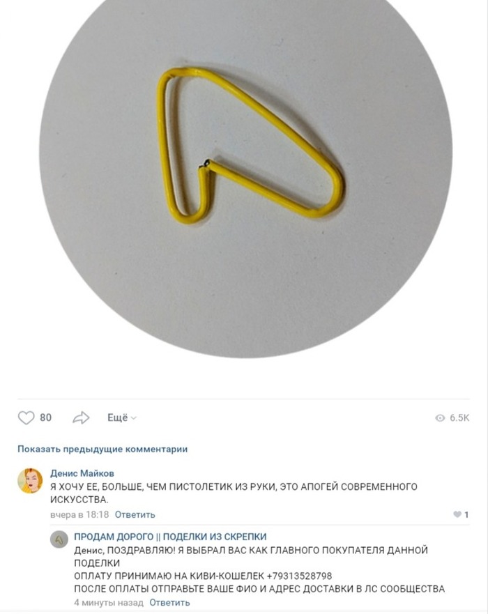 DenKYN "Апогей Искусства" 6 лет назад https://pikabu.ru/story/startap_iz_zheltyikh_skrepok_6606174 Показать полностью 1 [моё] Скрепка Искусство Покупка Меценатство