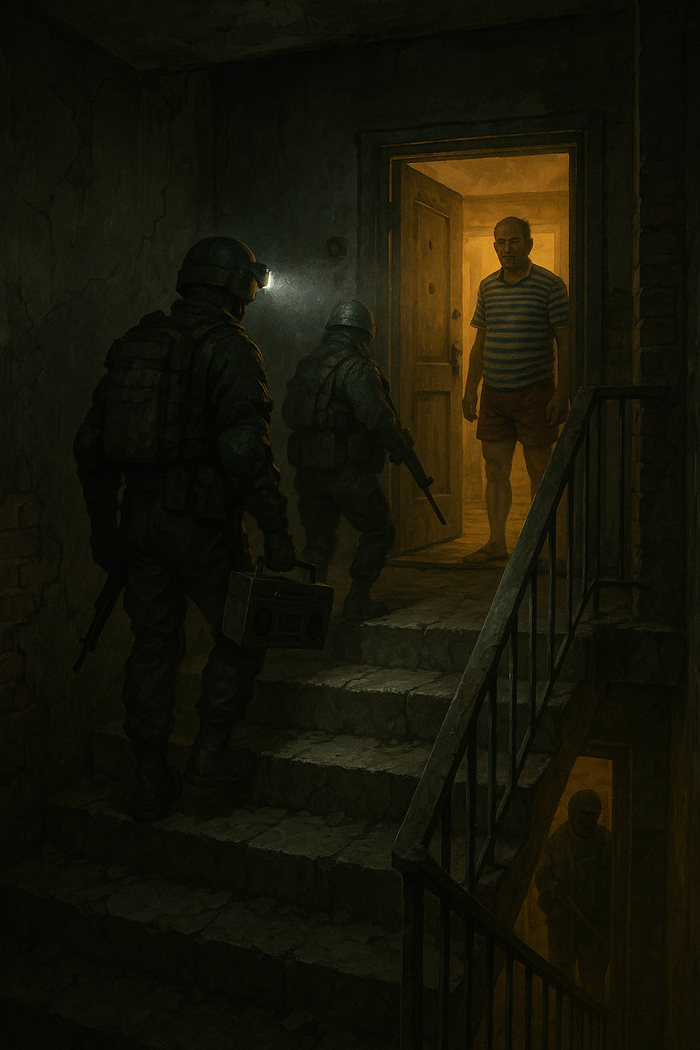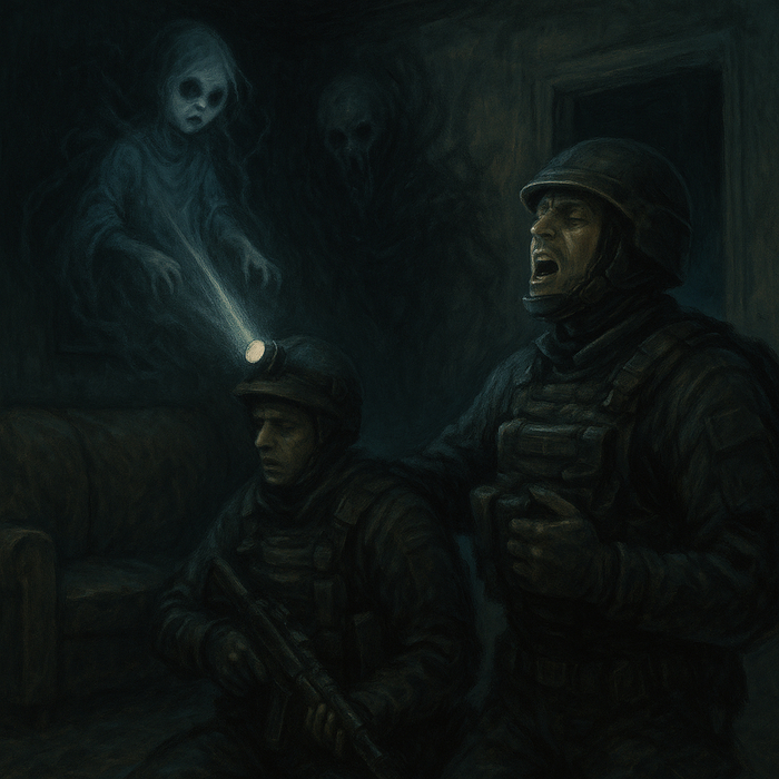 Как только он вошёл, свет на площадке погас. Дом задрожал. Лестница, на которой я стоял, начала исчезать - перила плавились и стекали в бездну. Боец успел отскочить и, сняв винтовку с плеча, стал вглядываться в темноту квартиры. Но даже при открытой двери свет фонаря не проникал внутрь.
