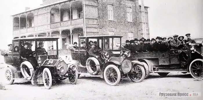 Легковые машины NAG AC4 11/18 PS и открытый автобус предпринимателя Васильева перед отправкой в Джульфу. Тифлис, 1910 г