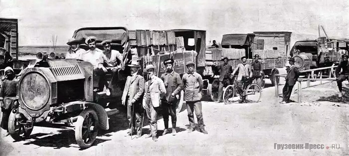 Три автопоезда NAG P8 40/45 PS на Джульфа-Тавризском шоссе. В передней машине сидят (слева направо): предприниматель автомобильного сообщения Васильев, секретарь Российского консульства Беляев, управляющий обществом Джульфа-Тавризских дорог Трескинский, 1911 г.