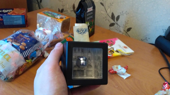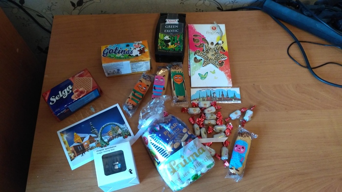 И вот такой ништяковый набор сладостей и подарков: открытка с наилучшими пожеланиями для меня, ёлочная игрушка, чаёк, магнитик, магический куб и сладости )