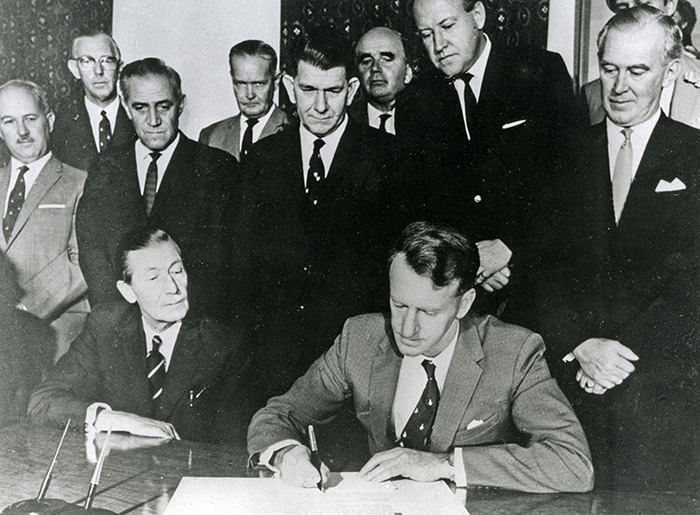 5 ноября 1964 года в Родезии прошел референдум по независимости. За независимость проголосовали 90% голосовавших при явке 61,9%. Этот результат вдохновил власти Родезии на одностороннее провозглашение независимости. Через год, 11 ноября 1965 года, правительство Родезии приняло заявление об одностороннем провозглашении независимости (на фото подписание Декларации о Независимости), (при этом формально Родезией правила королева, потому что родезийцы надеялись со временем получить статус доминиона). Реакция Великобритании не заставила себя ждать.