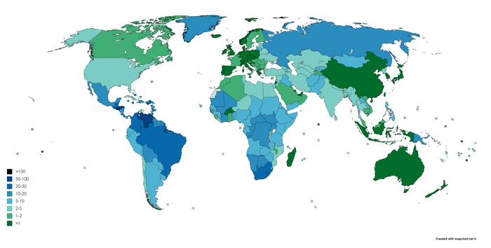 2. Насколько Северная Корея богата? Точно этого никто не знает. Книга фактов ЦРУ даёт оценку в 1800 долларов по ППС на душу. Доверять этой книге не стоит совершенно: я ещё помню, как црушники рисовали Зимбабве ВВП на душу по паритету 500 долларов, то есть сильно меньше, чем у ЦАР и ДР Конго. У каждого, кто имеет хоть какие-то представления об экономике Африки, это вызывало искренний смех. Потом ЦРУ исправилось и внезапно обнаружило, что на самом деле у Зимбабве на душу приходится 2000 долларов - ошибочка всего-то вчетверо. Банк Кореи (Южной) оценивает ВВП КНДР на душу в 1300 долларов. Всё это, конечно, гадания на кофейной гуще. Что можно утверждать - сегодня средний северокореец в десять-двадцать, а то и сорок раз (хорошенький разброс!) беднее своего сородича по южную сторону Демаркационной линии.