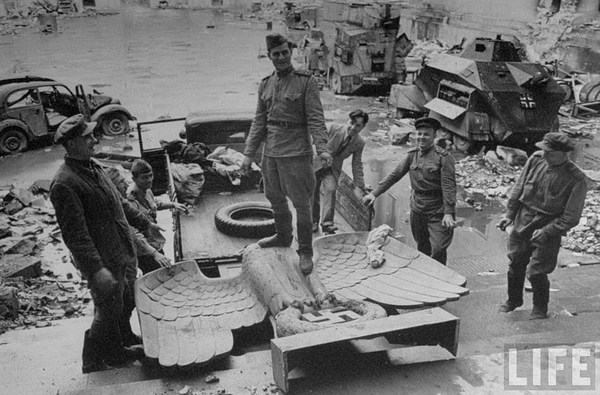 "Техника у моста через реку Шпрее в районе Рейхстага". Одно из самых горячих мест штурма. Просто завал из техники - и пушки и танки всяких видов и телеги какието.. всё закопченное.. И самое апокалиптичное что в кадре, при всей его насыщенности техникой, вообще нет ни одной живой души, не считая двух бродячих собак, которые своим присутствием фотографии добавляют еще больше пронзительности..