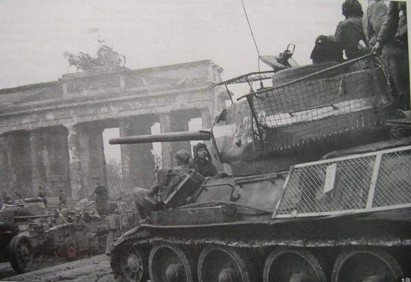Т-34-85 у Бранденбургских ворот. Флаг уже установлен. Обратим внимание на противокумулятивные экраны на бортах и на башне.