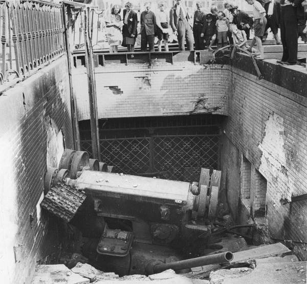 "Т-34-85, упавший во вход станции метро на Александерплац в Берлине" (так подписана фотография). Как он туда попал - не успел затормозить на асфальте? или поврежденный танк спихнули туда в ходе продолжавшегося наступления, чтобы не загораживал дорогу другим танкам? Люк механика-водителя открыт, хочется верить что экипаж спасся - погибнуть за несколько дней до победы вдвойне горше.