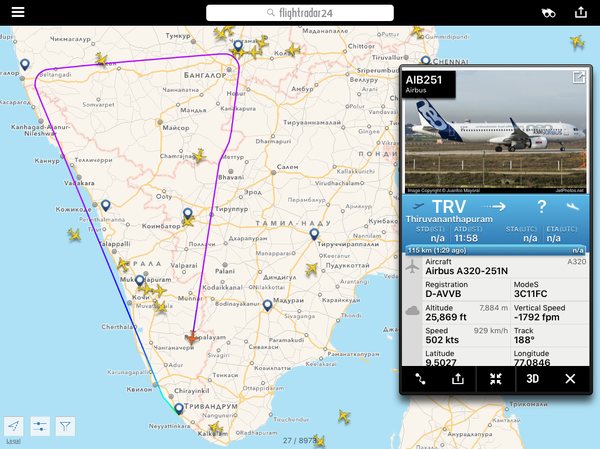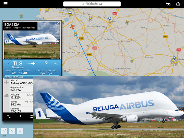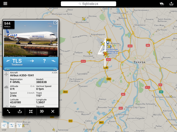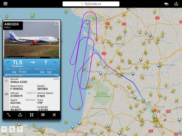 Еще пару слов о производстве. Вот свежий скрин (09 сент). Судя по нему свежесобранный А320 облётывается перед сдачей заказчику - индийской авиакомпании IndiGo (может быть у нас она совершенно неизвестна, но немного статистики - у этой авикомпании в наличии 113 бортов, а для сравнения у Аэрофлота - "всего" 188), кстати, облётывается не над густонаселенной Тулузской губернией, а подальше - над Бискайским заливом. Это вполне разумно. И фото этого борта, если мы посмотрим внимательнее, ещё даже без двигателей - то есть совсем свеженький. Но если загуглить его регистрационный номер F-WWDG - начнутся чудеса. Под этим номером кто только не проходит; не вдаваясь в детали - это тестовый номер, только на время производства, до момента передачи заказчику, после чего борт приобретает свой, "личный" регистрационный номер.