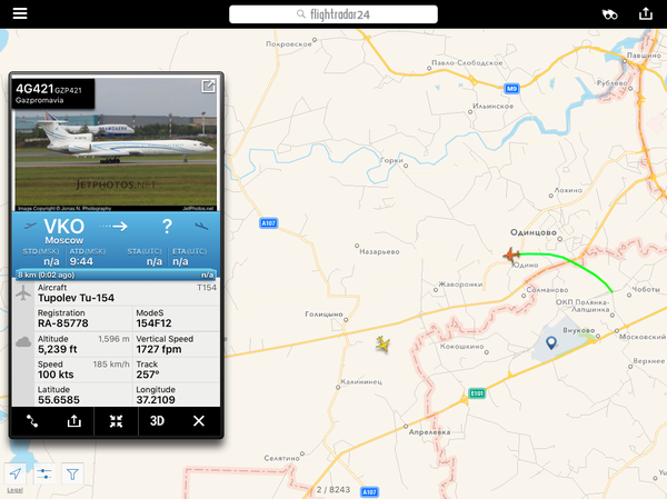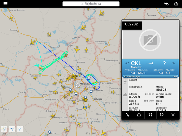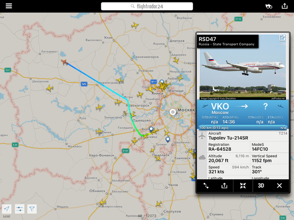 Субботний скрин. Разгоняют облака перед праздником - из Чкаловского поднялся Ту-204. Разумеется, там он не один - но другие борта не отображаются. В этом случае у Ту мониторинговые функции.