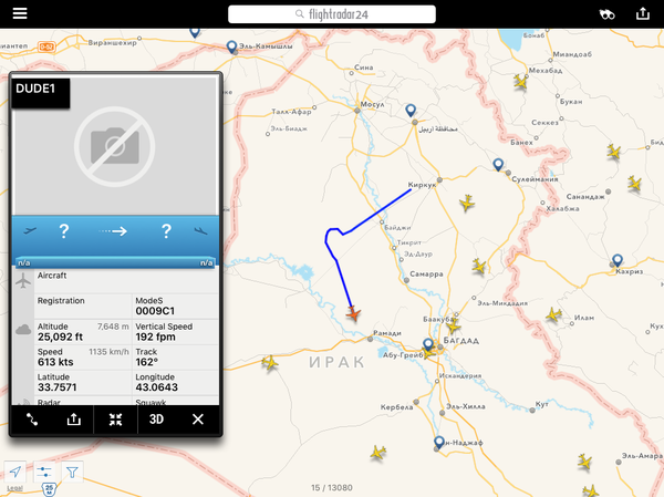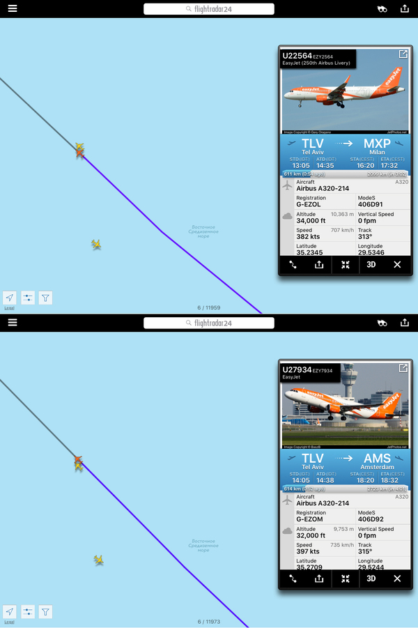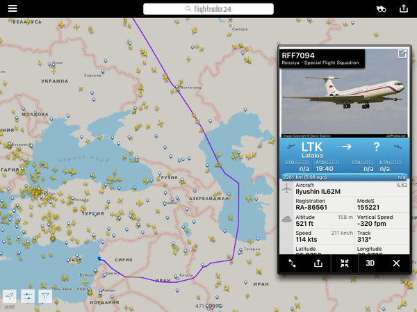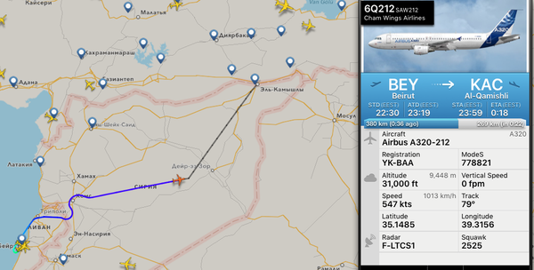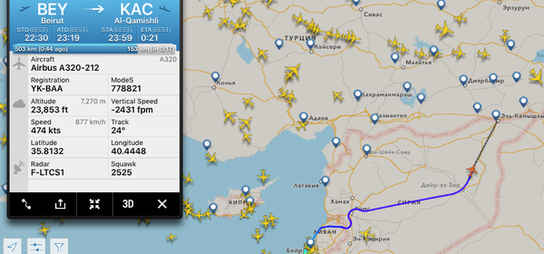 Редкая в наше время ситуация - пассажирский Аэробус в небе Сирии. Вылет из ливанского Бейрута, лететь ему через всю страну к турецкой границе. Лететь-то всего ничего, меньше часа, но, как мы помним, место это не самое спокойное на планете. Итак, что мы видим - нетипичное для обычных условий маневрирование (очевидно облетает линию боевого соприкосновения воюющих сторон) и еще более необычно - скорость. 1013 км в час. Круто для простого арбузика (да, я понимаю разницу между воздушной и истинной скоростями и мне известны скоростные характеристики А-320) т.е. получается что пилоты выжимали все возможно допустимое. Сбросив скорость и начав снижение борт транспондер отключил почти сразу после того как я сделал второй скрин.