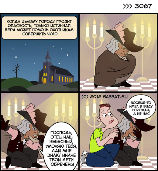 Партия хантеров. Один с истинной верой пошел в церковь и молится о божественном знаке. Причина - если не найдут демона, то городу через пару дней капец.