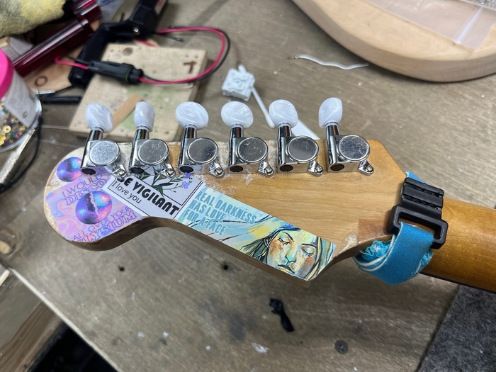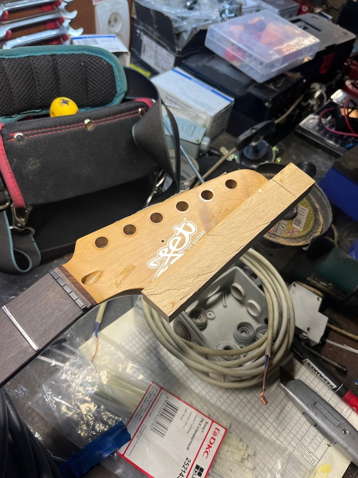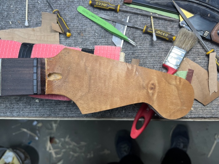 Были предприняты попытки попасть в тон печёного клёна. Хоть приклеивался так же печёный клён, но степень прожарки, видимо, была разная. В связи с этим у соседей был позаимствован шпон для перекрытия всей головы. К тому же шпон помог закрыть отверстия от ретейнера, потому что в будущем (как оно и получилось) планировались к установке колки с профилированной высотой (на 6ой струне выше, на 1ой ниже) для лучшего прилегания струн к порожку.