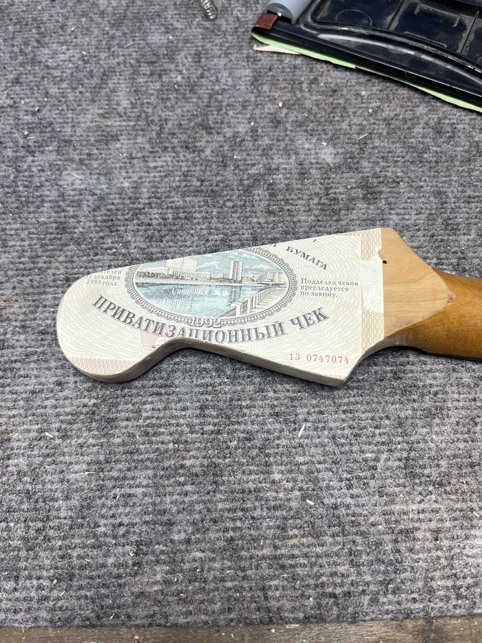 Появляется резко идея дать гитаре серийный номер. На той же барахолке покупаются два приватизационных чека и клепаются на ПВА к тыльной стороне. Тем самым мы решаем несколько задач одновременно. Пропадает видимый стык двух деревяшек сзади и появляется номер.