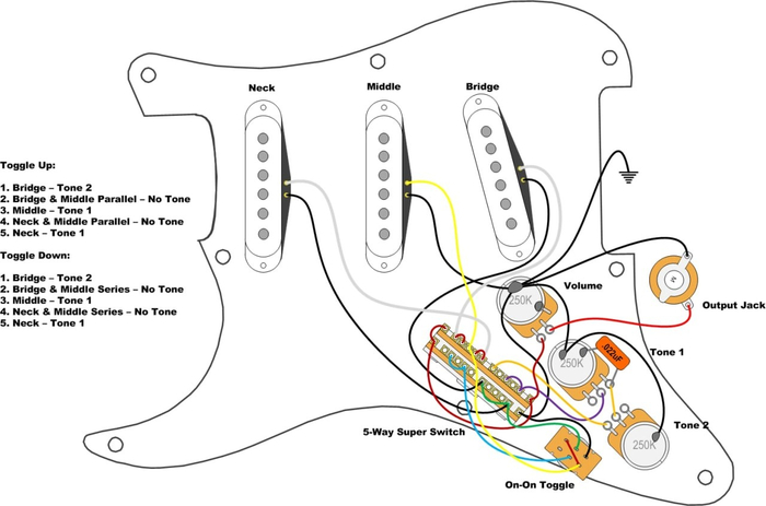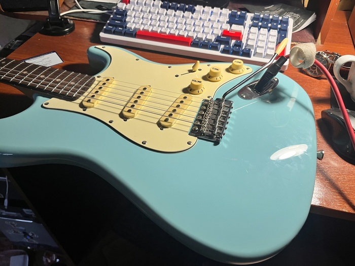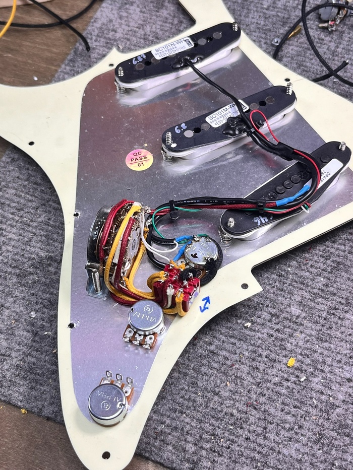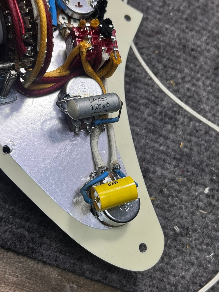В итоге передо мной классический страт на трёх синглах, пятипозиционном переключателе, обычной пятке и всеми теми приколами, которые есть в подавляющем числе стратокастеров планеты.